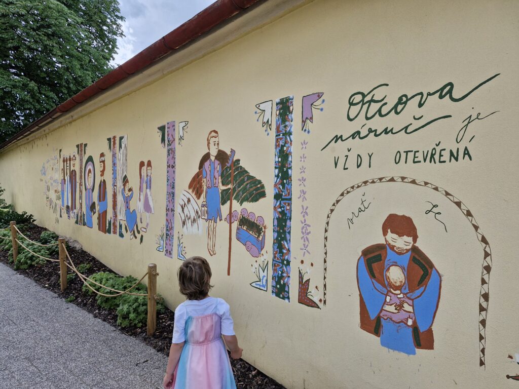 Naše putování jsme začali v kavárně Kavárna Ztraceno, kde mají nejen výbornou kávu a dortíky, ale také moc pěkný dětský koutek. Je to místo, kde se budete cítit jako doma – útulné, klidné a přátelské. Já jsem si vzala kávu s sebou a vydali jsme se do protější Farské zahrady.