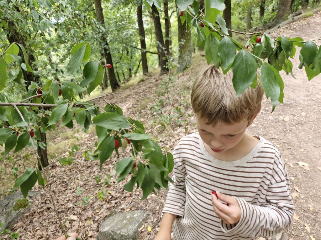 Na cestě nás zaujalo i spoustu keřů vzácného dřínu obecného. Jeho červené plody chutnají trochu jako hodně trpké višně. Poprvé v životě jsme je ochutnali – syrové moc nelákají, ale marmeláda z dřínu by mohla být zajímavá.